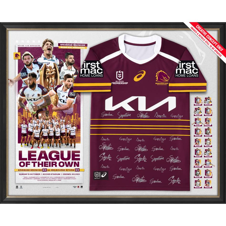 - Features an official Brisbane Broncos 2025 jersey, personally signed by the 2025 Premiership team